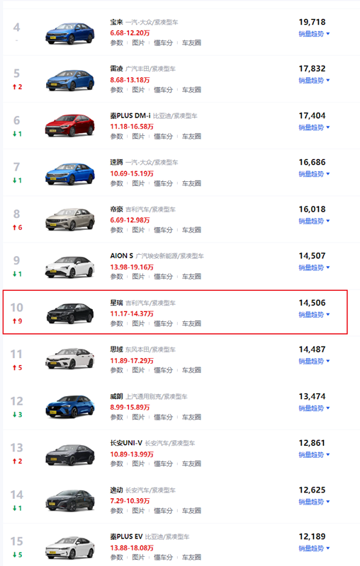 近日,各大汽車(chē)廠商今年10月份的銷(xiāo)量成績(jī)終于公布了,雖然A級(jí)轎車(chē)榜單前三名依舊和9月份一樣,都是被日產(chǎn)軒逸、大眾朗逸、豐田卡羅拉所占據(jù),但,10月份的A級(jí)轎車(chē)榜單卻出現(xiàn)了一款“黑馬”車(chē)型,因?yàn)檫@款車(chē)在9月銷(xiāo)量榜單里還是第十九名,但是到了10月份,卻以月銷(xiāo)14506輛的成績(jī),銷(xiāo)量“排名”直接上升了9個(gè)名次,躍居至10月份銷(xiāo)量榜單第十名位置,該車(chē)就是2023款全新吉利星瑞,這款車(chē)有什么特色呢?該車(chē)系哪款車(chē)型可以參考呢?一起來(lái)了解一下吧。